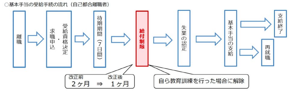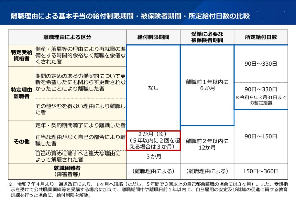 そのため、2020年(令和2年)から、自己都合離職者の給付制限期間が3か月から2か月に短縮され、2025年(令和7年)4月1日以降では給付制限期間は1カ月になりました。