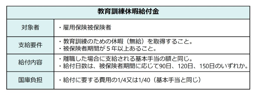 令和7年10月1日には「教育訓練休暇給付金」が創設され、「雇用保険被保険者が教育訓練を受けるための休暇を取得した場合に、基本手当に相当する給付として、賃金の一定割合を支給する」とされました。